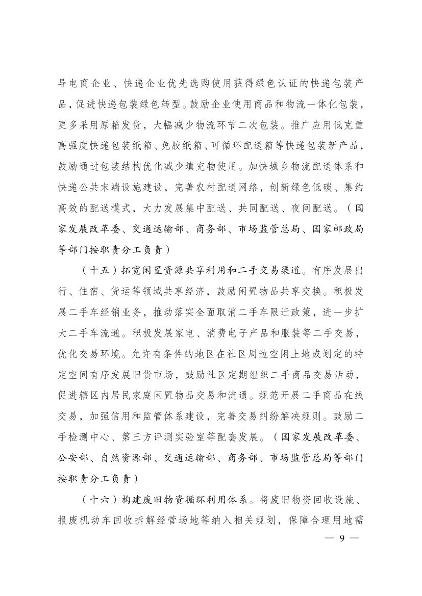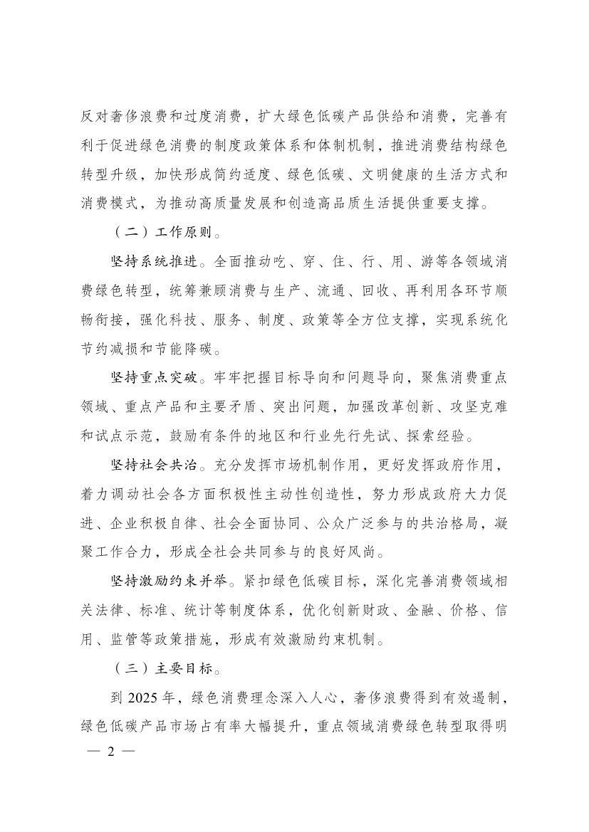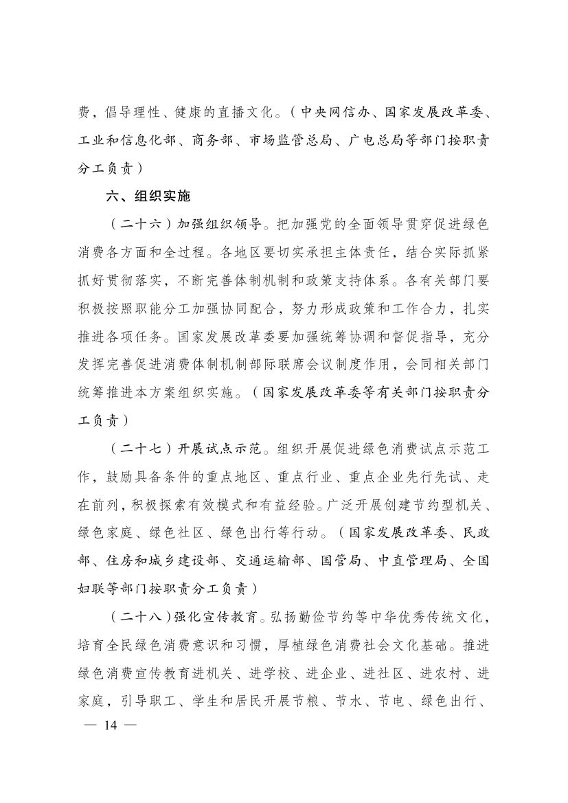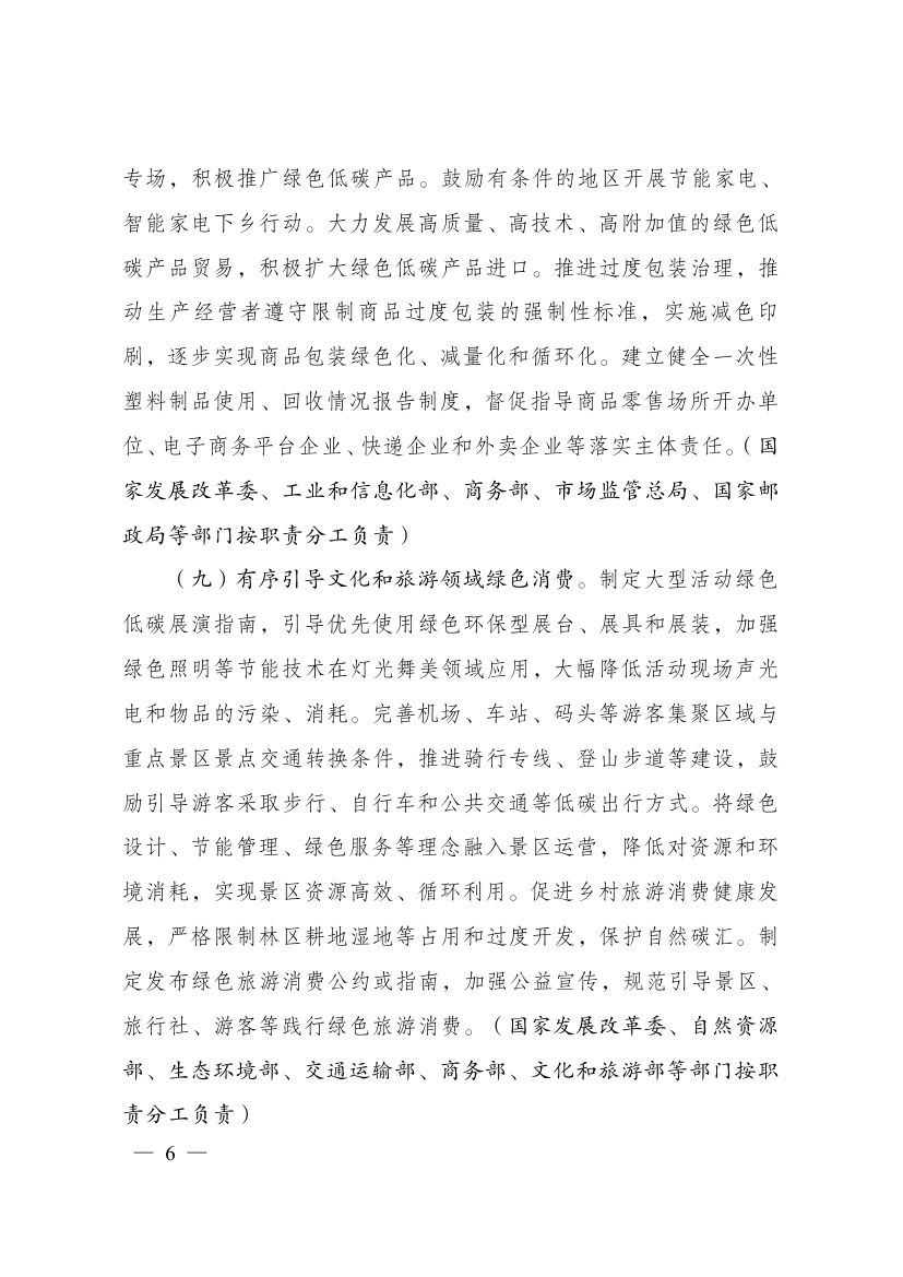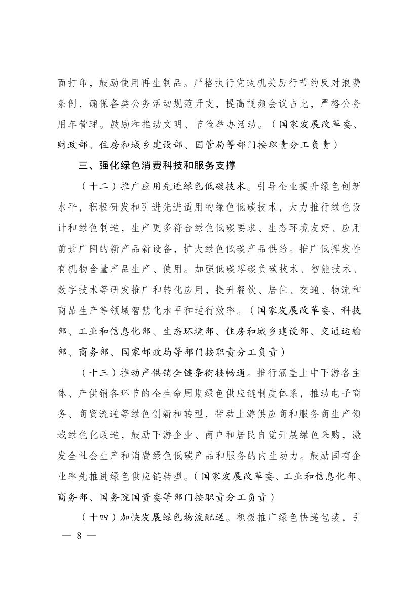 為深入貫徹落實《中共中央、國務院關于完整準確全面貫徹新發(fā)展理念做好碳達峰碳中和工作的意見》和《2030年前碳達峰行動方案》有關要求,根據(jù)碳達峰碳中和工作領導小組部署安排,國家發(fā)展改革委、工業(yè)和信息化部、住房和城鄉(xiāng)建設部、商務部、市場監(jiān)管總局、國管局、中直管理局會同有關部門研究制定了《促進綠色消費實施方案》?,F(xiàn)印發(fā)給你們,請結合實際,認真抓好貫徹落實。