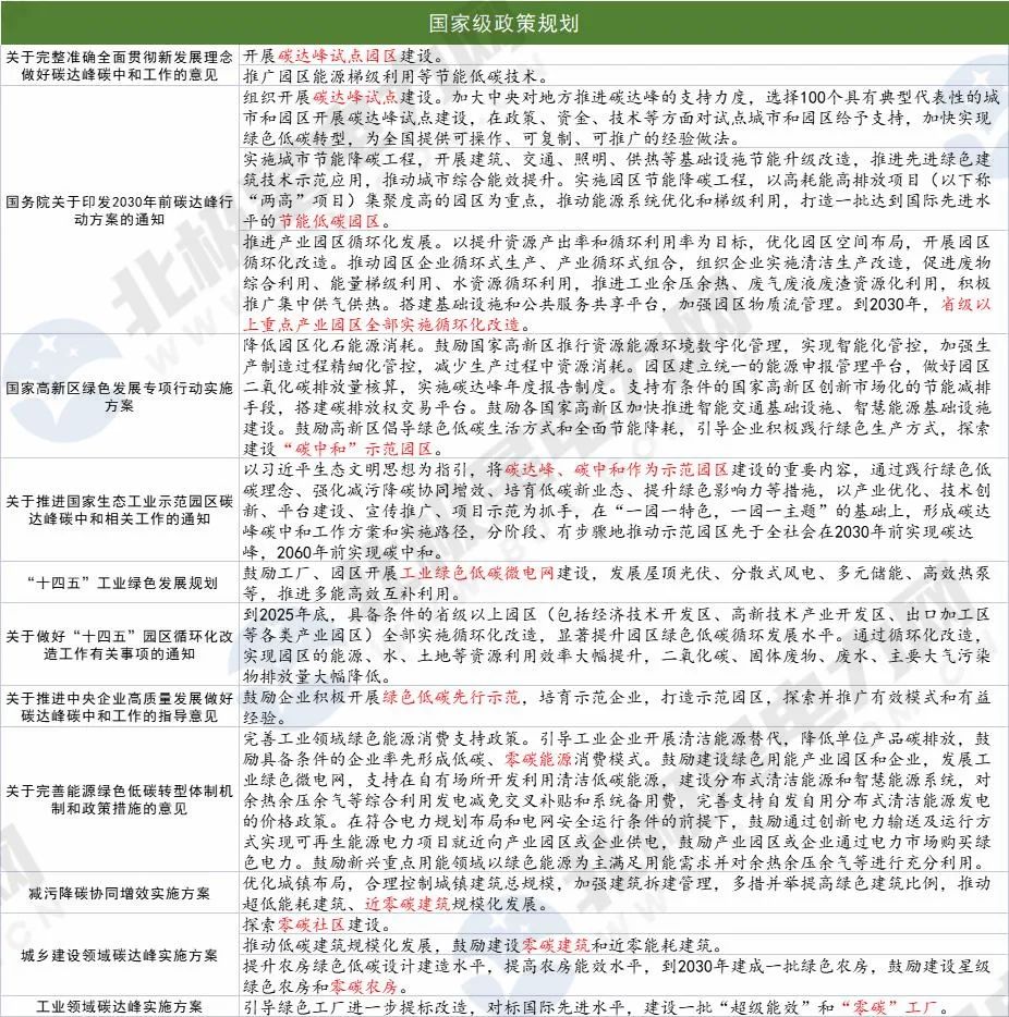 據(jù)北極星電力網(wǎng)梳理,“雙碳”目標提出之后,從國家層面,“1+N”的政策體系建設(shè)提上日程,多個配套政策規(guī)劃接連出臺。國家級政策規(guī)劃明確提出要開展碳達峰、碳中和示范園區(qū)建設(shè),零碳建筑、零碳社區(qū)、零碳園區(qū)、零碳能源消費模式亦均有提及。從地方層面,目前已有20余個地區(qū)“搶灘”布局,發(fā)布了超40條規(guī)劃政策。各層級政府出臺的支持性措施亦不斷加碼。